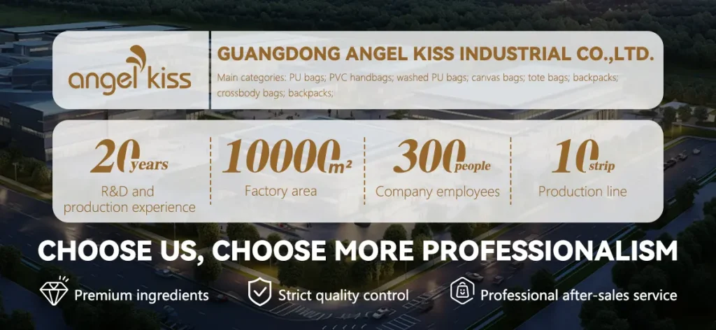 Angelkiss Industrial Co., Ltd. is located in Shiling, Guangdong, specializing in washed PU and canvas bags.